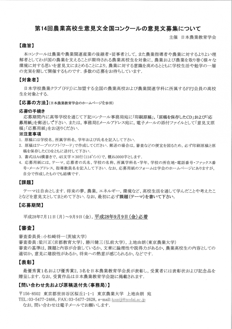 日本農業教育学会 農業高校生意見文全国コンクール事務局より、案内が届きました。